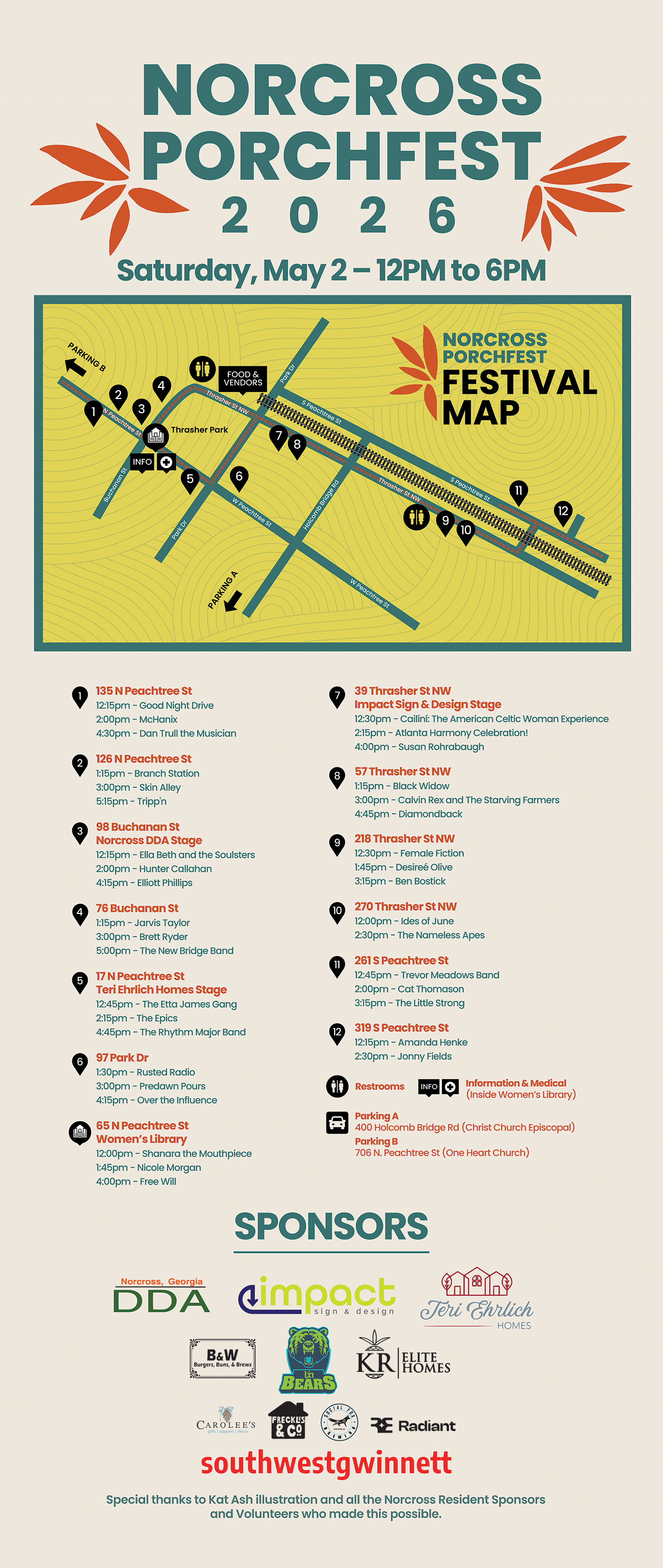 Congratulations to the performers and bands selected for Norcross Porchfest 2026! Each act was chosen by a jury of Norcross residents from nearly 50 artist applications. Thank you to everyone who submitted. The quality and range of talent made this an incredibly difficult process for the selection team.